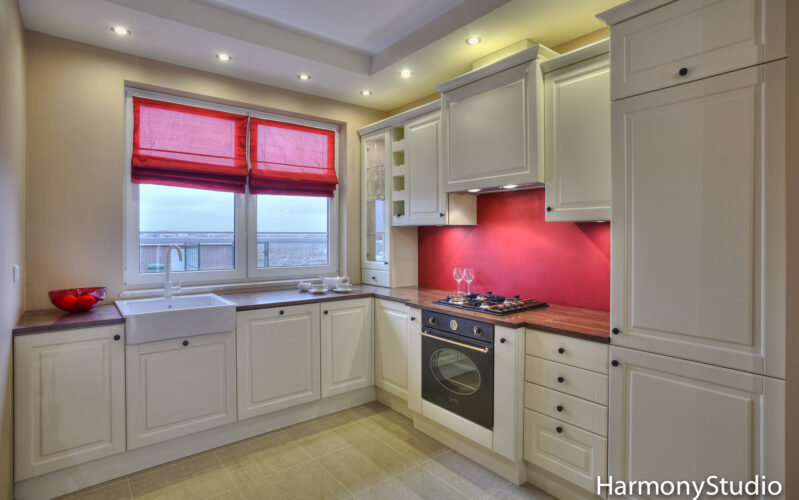 KUCHNIA KLASYCZNA Z DREWNIANYM BLATEM Kuchnia w stylu klasycznym. Piękne fronty w jasnym kolorze zostały skontrastowane drewnianym blatem. Całość wygląda przytulnie i elegancko. Charakter kuchni nadaje stylowy piekarnik firmy SMEG.
