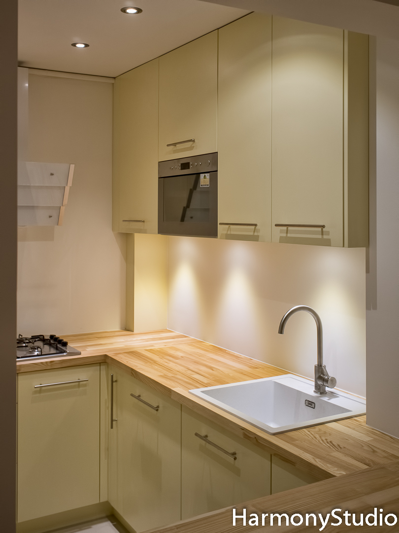 KUCHNIA KREMOWA Z DREWNIANYM BLATEM Mała kuchnia w bloku z wbudowaną mikrofalówką. Drewniany jesionowy blat dopasowany do drewnianej podłogi. Blat zabezpieczony wysokiej klasy naturalnym olejowoskiem.