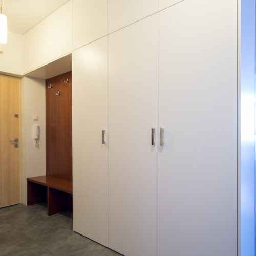 Szafa otwierana z frontami z MDF lakierowanego na biały półmat. Widoczne boki zasłonięte maskownicami w kolorze frontów. Przy wejściu wnęka z płytą na ścianie i ławeczką w kolorze orzecha. Górne fronty otwierane na docisk – BLUM Tip-on.